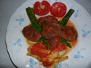 Yapılışı: Derin bir kasede kıyma, rendelenmiş soğan, sarımsak, ufalanmış ekmek, yumurta ve baharatlarla yoğurulur. Bir saat dinlendirilir. Ceviz büyüklüğünde parçalar koparılıp yuvarlanır. Az yağda kızartılır. Kızartma tavasına en son domates püresi dökülüp pişirilir. Pişen sosa köfteler dizilip kapağı kapalı 5dk. kısık ateşte tutulur. Afiyet olsun:)